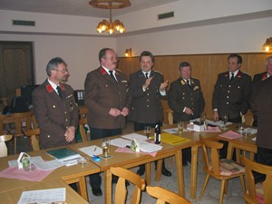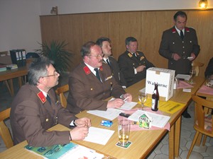 Kamerad Günther Staudenmayer berichtet über die Teilnahme beim „Fire-Cup“ 2006 in Raabs/Thaya und macht den Vorschlag ev. mit einem Bus zu dieser Veranstaltung zu fahren, damit auch ältere Kameraden zusehen können. Ehrenkommandant Franz Wutzl gratuliert per Handschlag dem neuen Kommando, gratuliert der Wettkampfgruppe zu ihren Erfolgen und wünscht sich auch im Ernstfall vollen Einsatz.